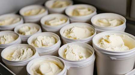 A variety of ice cream containers filled with creamy vanilla ice cream, ideal for showcasing frozen desserts in shops or events. Perfect for summer treats!