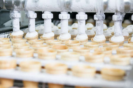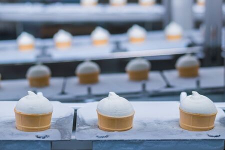 Ice-cream dairy factory - conveyor belt with icecream cones at modern food processing factory. Manufacturing, dairy industry, engineering and automated technology equipment concept