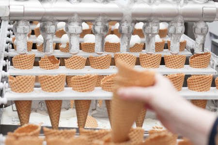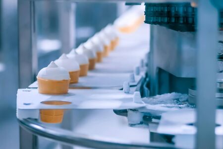Icecream automatic production line - conveyor belt with ice cream cones at modern food processing factory. Food dairy industry, manufacturing, engineering and automated technology equipment concept