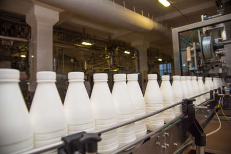 Milk bottles on conveyor belt in dairy factory. industrial background