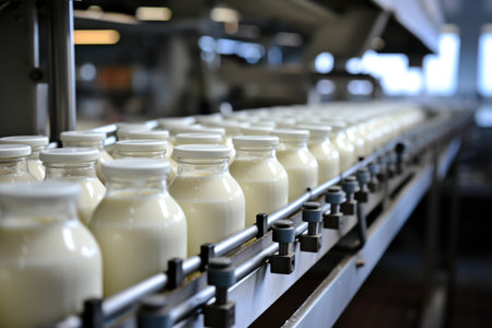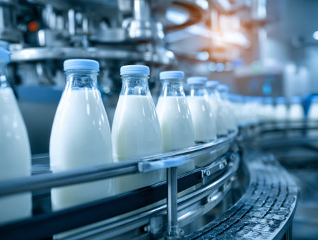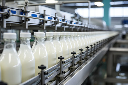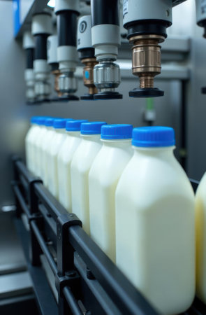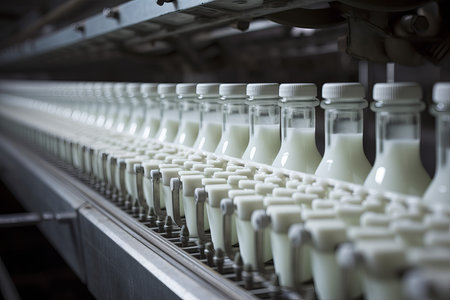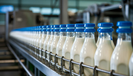 Streamlined bottled milk production line in a modern factory for enhanced manufacturing efficiency
