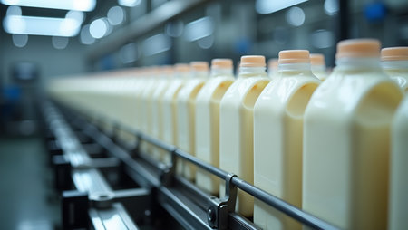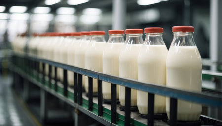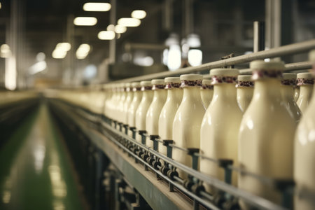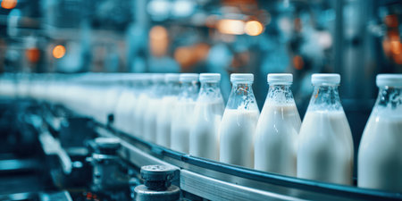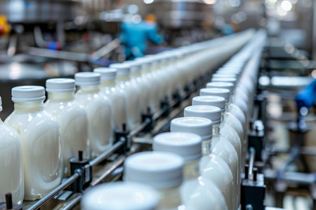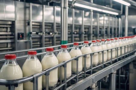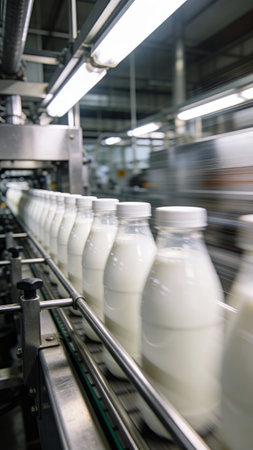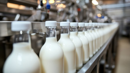 Brightly lit, uniform bottles of creamy milk glide smoothly on the conveyor, surrounded by polished machinery that emphasizes efficiency and modern dairy craftsmansh