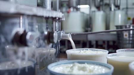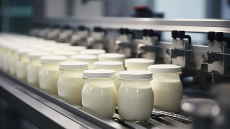 production line in a factory where jars of a white substance, possibly yogurt, are being filled, labeled, and sealed by machinery.Background