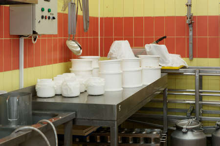 GRUYERE, SWITZERLAND - DECEMBER 31, 2014: Process of production of Gruyere cheese at the cheese-making factory of Gruyeres, Canton of Fribourg, Switzerland