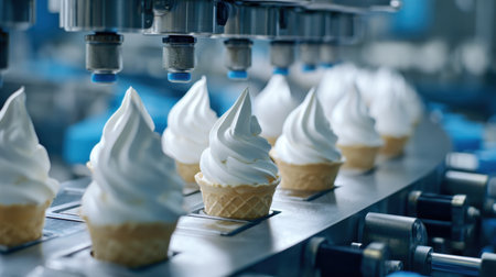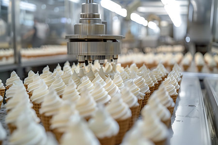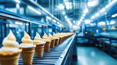 A vibrant view of an industrial ice cream production line showcasing soft serve cones moving along a conveyor. The scene highlights modern manufacturing technology and quality standards.