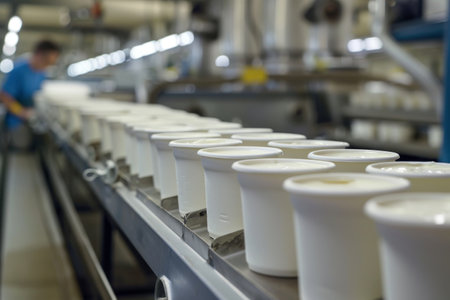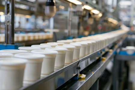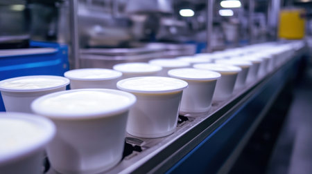 Yogurt cups move along a production line in a factory, highlighting the intricate technology and processes involved in dairy manufacturing for delicious snacks.