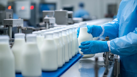 Milk production process in a dairy factory with workers handling bottles during quality control