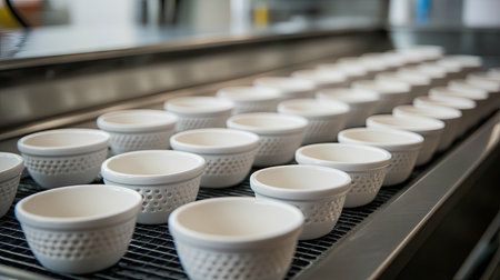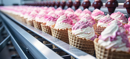 A captivating view of delicious ice cream cups moving along a conveyor belt in a modern factory setting, showcasing the industrial process of dessert production.