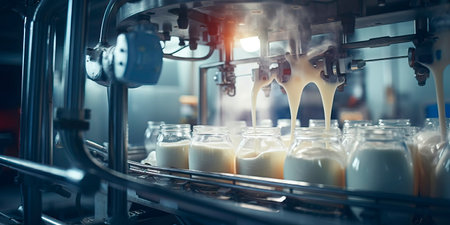 A close-up view of the milk bottling process in a modern dairy factory. Focus on glass bottles filled with fresh milk, emphasizing quality and efficiency in production.