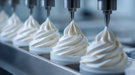 A close-up view of a modern production line showing soft-serve ice cream cones being created, highlighting the precision and efficiency of industrial dessert manufacturing processes.