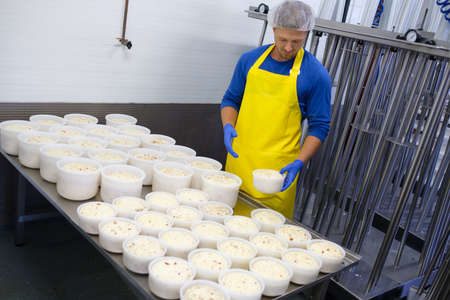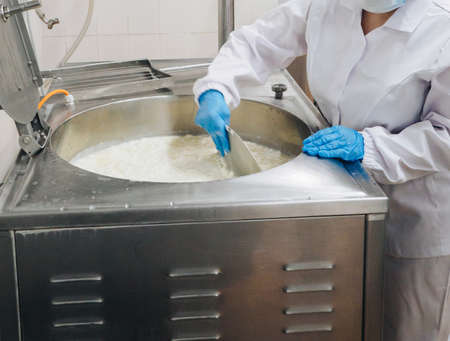 A woman in a chef's hat is making food. Industrial cheese production plant. Modern technologies. Production of different types of cheese at the factory.