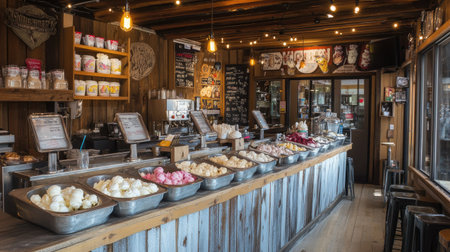 A rustic ice cream shop interior with vintage decor, showcasing a variety of ice cream flavors in metal tubs on the counter.
