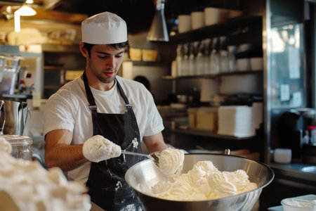 In a busy kitchen, a young chef skillfully scoops whipped cream into portions, readying it for dessert presentation. The atmosphere is lively, highlighting the culinary process.