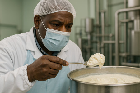 Food scientist inspecting creamy dairy product texture and consistency in manufacturing facility for quality control and safety.
