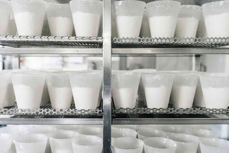 Automated robotic dairy yogurt production line in modern industrial plant for natural dairy products