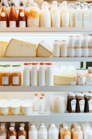 Brightly lit market shelf filled with an assortment of artisanal dairy products and fresh juices. The arrangement highlights a range of cheeses, milks, and natural beverages, inviting exploration.