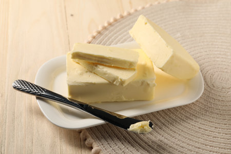 Chopping board with fresh butter on table