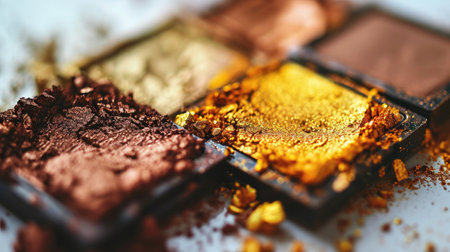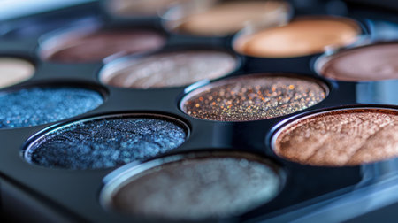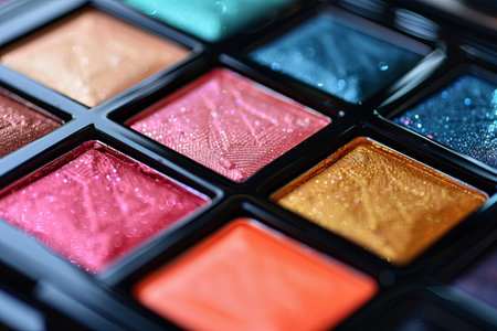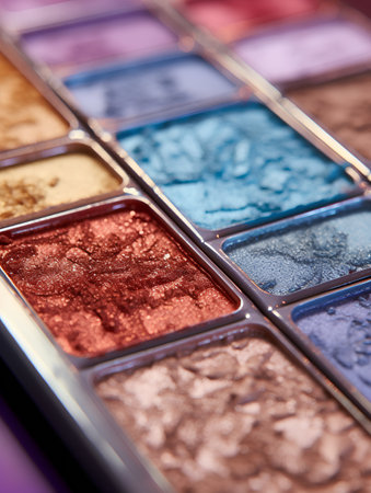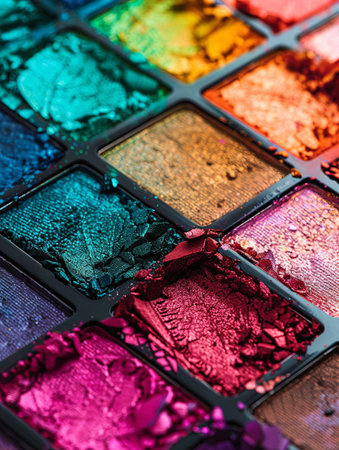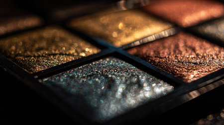 Stunning close-up of a glittery eyeshadow palette showcasing rich textures and a variety of colors, ideal for beauty and makeup enthusiasts.