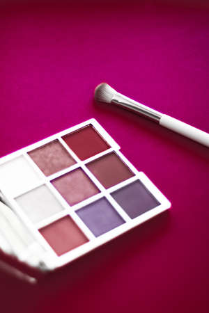 Cosmetic branding, mua and girly concept - Eyeshadow palette and make-up brush on rouge background, eye shadows cosmetics product for luxury beauty brand promotion and holiday fashion blog design