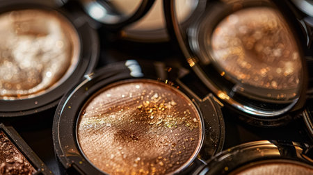 A variety of compact eyeshadow palettes featuring warm tones and metallics, isolated on a white background