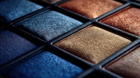 Vibrant eyeshadow palette featuring various shades of blue, gold, and copper. texture of eyeshadows is smooth and shimmery, perfect for creating stunning makeup looks