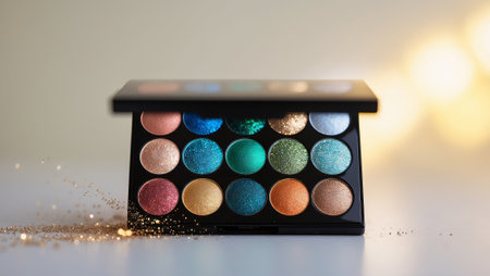 Colorful eyeshadow palette displayed with sparkly glitter on a smooth surface and soft light in the background