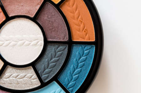 Nine colors eye shadow kit isolated on a white cosmetic table.