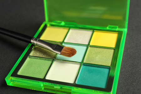 Cosmetic branding, mua and girly concept - Eyeshadow palette and make-up brush on graphite background, eye shadows cosmetics product for luxury beauty brand promotion and holiday fashion blog design