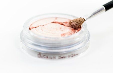 Pink eye shadow with brush closeup. Selectivr focus. Make up product.