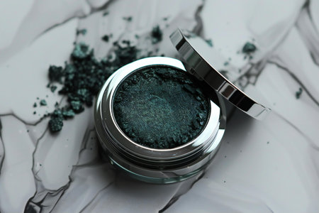 Jar with blue eye shadowle background, closeup. Cosmetic product