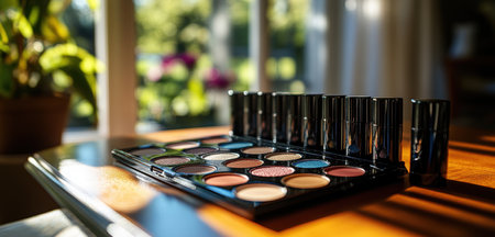 An AI generated illustration of an eyeshadow pallette with a variety of colors displayed on a table