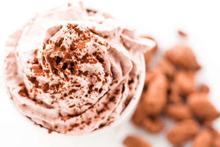 Delicious coffee dessert with whipped cream and coffee beans in a dark chocolate cup. A hand holds a small cup of coffee-flavored dessert with a chocolate spoon, perfect for a sweet treat Autumnal day