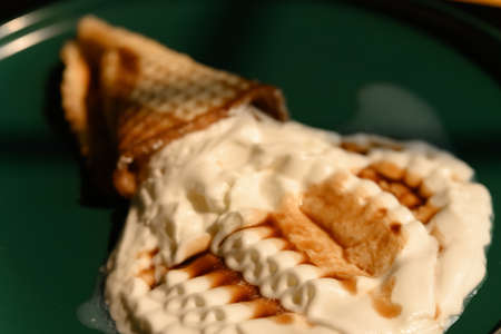 Vanilla ice cream in a bowl made of chocolate with copyspace