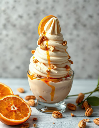 Delicious dessert with creamy ice cream, caramel drizzle, and orange garnishes served in a glass bowl