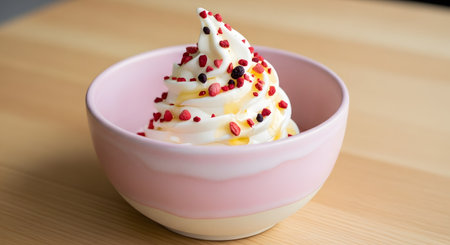 A bowl of pink frozen yogurt or soft serve ice cream swirled to perfection and topped with berry crumbs and syrup. The sweet treat is presented in a pink ceramic bowl on a wooden table, looking refreshing and delicious.