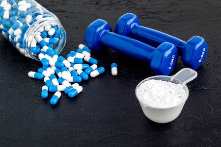 Creatine capsules, protein near shaker and dumbbells - sports supplements - on black background