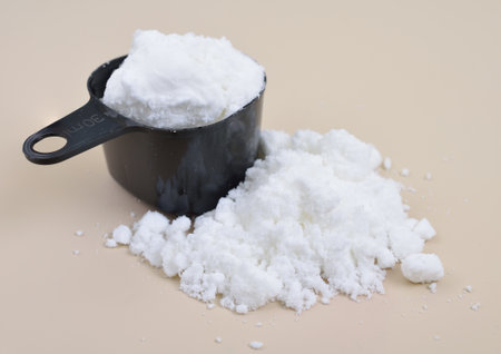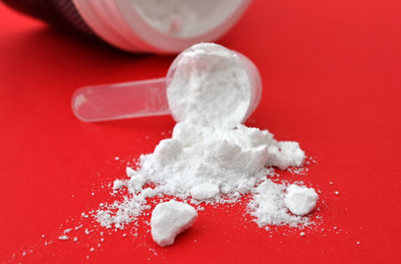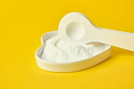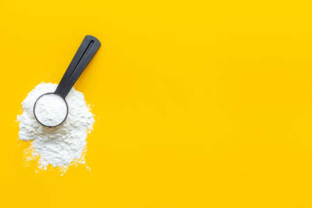 Creatine monohydrate powder and measure spoon on a yellow tablecloth.