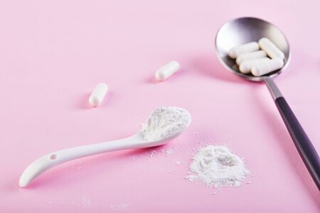 Collagen powder and pills on a pink background. Extra protein intake. Natural cosmetic supplement for skin, bones, joints and intestines. A plant or fish based. Side view. Copy space