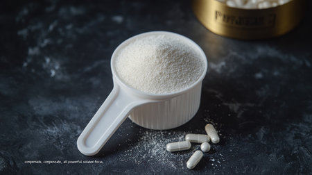 White powder in a white plastic spoon, a golden metal measuring cup with pills on a dark background. A male muscle-building concept with protein and pre-workout supplement, with G compensate, all powerful, solid isolated focus, a copy space banner for a health product, close-up shooting, 4K, ultra-realism, high detail, in the style of Kodak Ektar, stock photography. --chaos 30 --ar 16:9 --v 6.1 Job ID: 857b10c3-8ac9-432a-80c3-ae1616ee5086
