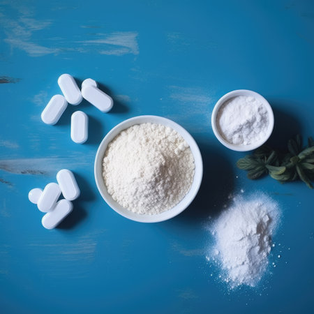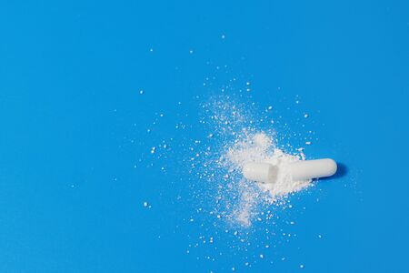 Collagen powder for the preparation of a medicinal mixture, a jar for pills, and a glass of water on a blue background. top view, horizontal