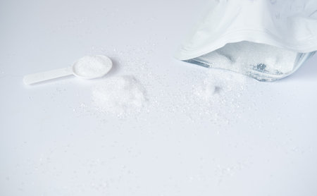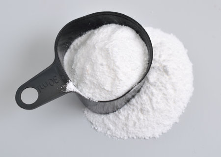 Sodium percarbonate powder or sodium carbonate peroxide in measuring spoon. It is abbreviated as SPC. Chemical substance used in eco-friendly bleaches with active oxygen. White chemical compound.
