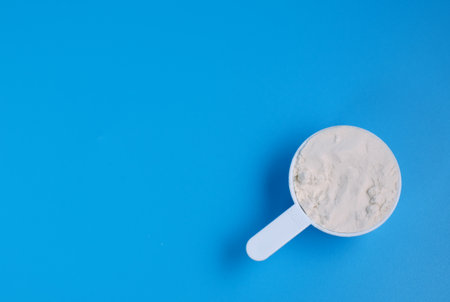 Top view of a blue container containing a white powdered sports supplement with a blue scoop