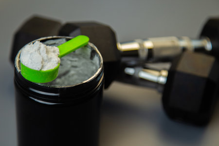 Fitness supplement container with green scoop filled with powder, positioned next to dumbbells on a gray surface, illustrating health and strength training