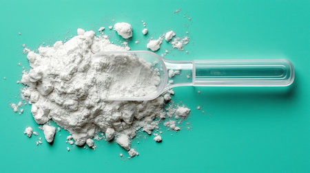A close up view of a fine white powder with a clear scoop on a vibrant turquoise background perfect for showcasing baking ingredients or flour.