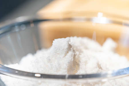 Close up to fresh sea salt in glass bowl with low light mood and tone.