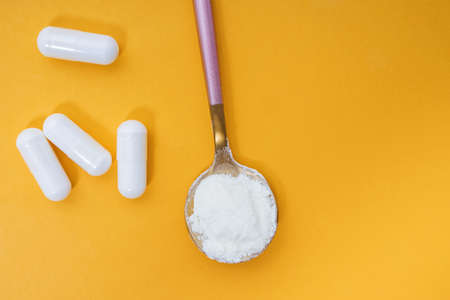 Natural dietary supplements in the form of powder, capsules or tablets. White powder in golden spoon on beige background. Top view, copy space.
