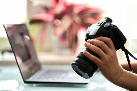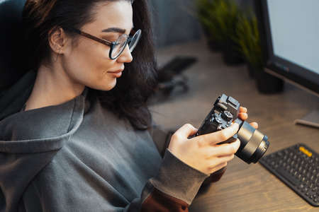 Young attractive brunette woman freelancer photographer watching photos in camera at home. Concept of freedom and creativity. Home office.