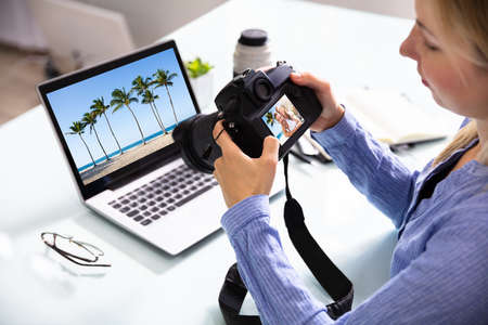 Female Editor Looking At Couple Photograph In DSLR Camera With Laptop On Desk