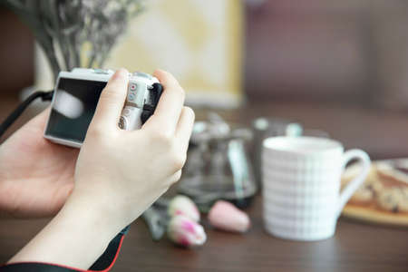 Photography blogging workshop concept. Hand holding camera taking photo of coffee in coffee shop.