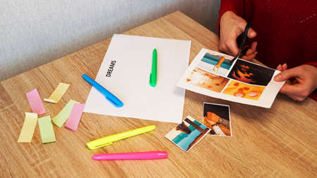 Young woman creating Feng Shui wish map using scissors. Blond cut out photos for visualization of dreams. All photos are taken by the author
